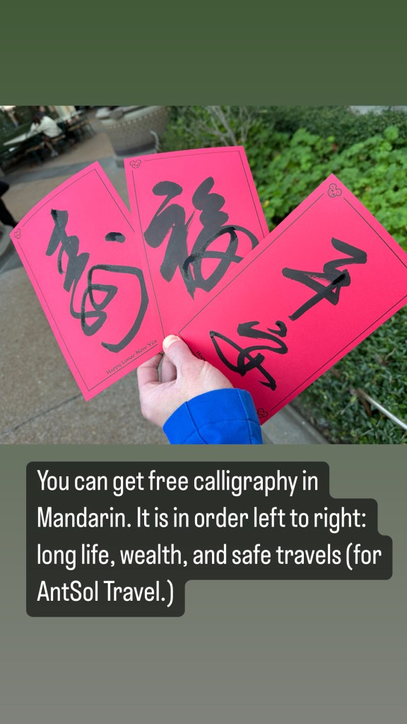 There were activities as well such as arts and crafts, and they even had a lucky wish wall where guests can put their wishes for the new year. I did two wishes, first was “To get a good following on my travel content and help guests plan their trip to Orange County! -AntSol Travel” this is a bit self patronizing but it is my wish for this year. After posting it, one of my family members suggested doing a second one with “Good health & prosperity for friends & family!” More well wishes for the people I know than just myself. You can get free calligraphy for the zodiac animal of your birth year, wishes, or a phrase that is not too complicated in Mandarin from trained calligraphers. The three I got were wishes, It is in order from left to right: long life, wealth, and safe travels (for AntSol Travel.)