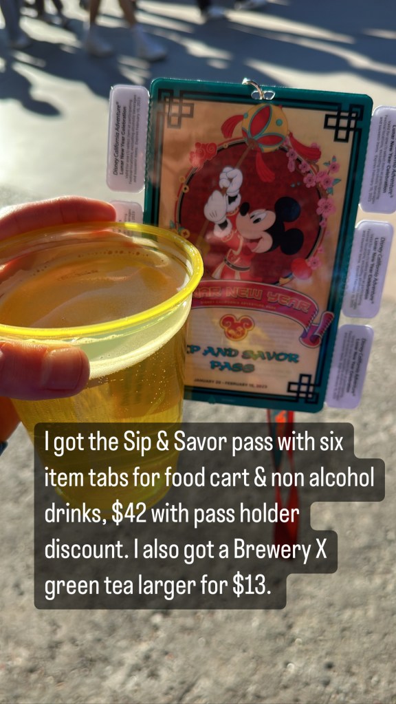 For the festival food carts, you can purchase a Sip & Savor Pass, which for $50 or $42 for Magic Key Holders, prepays for six nonalcoholic cart drinks and food items that qualify for the stubs. The alcoholic drinks like the Brewery X Green Tea Larger beer below, does not qualify for the stub.
