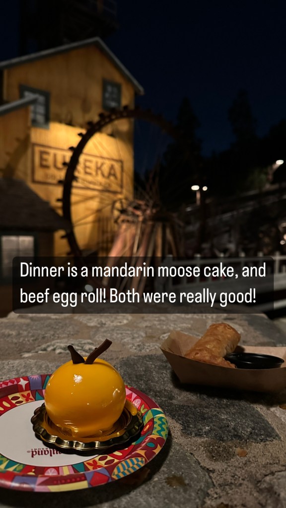 The food cart menus were swapped from holidays to the Disney culinary twist on Asian cuisine. I personally had dinner & a beer, for dinner I had mandarin moose cake and a Quesabirria egg roll. The quessabarra is a carnitas quesadilla in a hard taco shell, but it is wrapped up in an egg roll. The mandarin moose is shaped like a mandarin with chocolate pieces on top as the leaf & steam, inside has a white moose and mandarins in the middle. The drink I had was Brewery X’s green tea rice beer lager, it was on the light & crisp side at about 5% APV, and the taste was good as the green tea taste was on the lighter side. The beer is not listed on Brewery X’s website, so I have to have it during the festival to try it. I also had a seasonal churro, the almond cookie churro with sliced almonds, cookie crumbles, and almond-flavored icing. There were many more dishes, however, I was there myself, and I could only vouch for so much food, check out the full food & beverage list here.