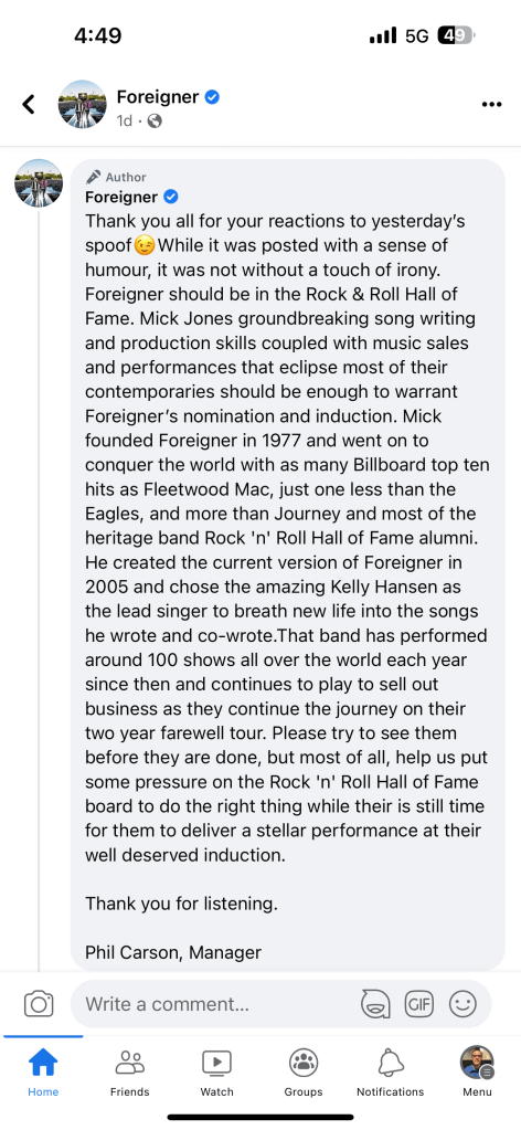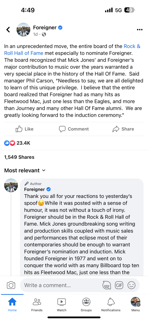 Foreigner posted on their Facebook page that they were inducted into the Rock n’ Roll Hall of Fame. Unfortunately, it was an April Fool’s joke, even though they already have a huge catalog of hits, they should be considered for next year. The screenshots are below.