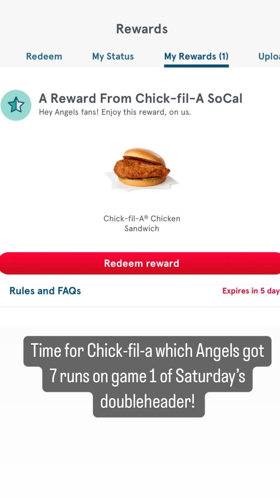After work, I jogged over to Chick-fil-A, about a block south of Ralph’s in Orange on Main Street, as I got a free Chick-fil-A sandwich since the Angels got seven runs on Saturday, and to see what things were like around the neighborhood. Anaheim received about two inches of rain, so there was a fair amount of standing rainwater in the Santa Ana River. Through the neighborhood, the sun dried the sidewalks & roads out, and the smaller water channels, such as the Bitterbrush Channel got a good amount of water. When I got to Chick-fil-A, many other people got their free chicken sandwich as well. Heading back to the apartment, at Angel Stadium, the Angels vs. Cincinnati Reds game was postponed to Wednesday due to an oversaturated field, announced at 10 AM earlier that day. There were a handful of baseball fans, mainly from Japan, who were not aware of the time change since they did not buy tickets ahead of time and went to the box office to buy it then. At least one young baseball fan is making the most of it by doing some batting practice with one of the Angels staff.