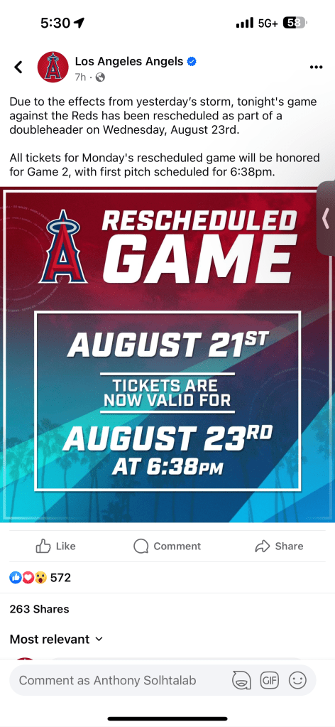 The Angels, Dodgers, & Padres all have home games this weekend. Friday & Saturday games will go on as scheduled. However, Sunday’s game will be rescheduled to Saturday as a doubleheader.