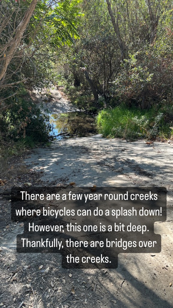 Along the way, there are caves to see, streams to splash though, but varying terrain to get there. are a few caves along the way that I checked out, including the dripping cave which was not dripping since there has been any recent rain, and cave rock which you look into a little cave. The trail has three year-round creeks: the first one was shallow & I did a splashdown, the second was a bit deeper but hikers were taking a snack break so I dismounted my bike so I would not splash them, and the third was a deeper creek which I just went on the footbridge so avoid getting too wet. However, at various points, rainfall swept sand into the canyons, making it a bit hard to bike or run through.