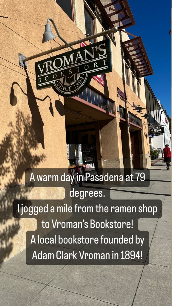 After lunch, I jogged a mile down Colorado Boulevard to Vroman’s Bookstore, a local bookstore founded by Adam Clark Vroman in 1894. Inside, there were books of all genres, including travel books of Los Angeles, called “Secret Los Angeles: an Unusual Guide,” for interesting locations and things around Los Angeles County, perfect for future Los Angeles trips. After purchasing the book, I was so exhausted from jogging that I decided to head back to Anaheim.