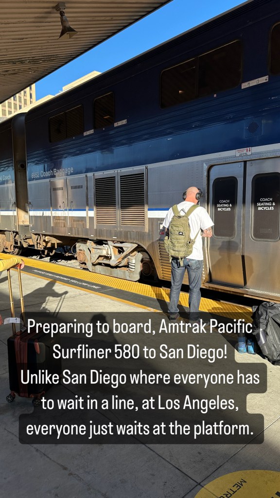 At Los Angeles Union Station, I wanted to take footage of the train departing, however, the LA Metro train operators were taking a while switching shifts & the platform reeked of pee, so I decided to go to the station. In the station, it was 2:20 pm, so I bought a Wetzel’s Pretzel and ate it in the waiting area before my Amtrak Pacific Surfliner 580 to San Diego departed at 3:10 pm. The station food court also has a Starbucks, a convenience store, and a couple more counter-service restaurants as well. At 2:50 pm, the boarding call for my Amtrak Pacific Surfliner 580 was announced, and I headed to platform 14. Unlike San Diego where everyone has to wait in line, in Los Angeles, everyone just waits at the platform before the doors open. Then doors opened at 3 pm and departed at 3:10 pm.