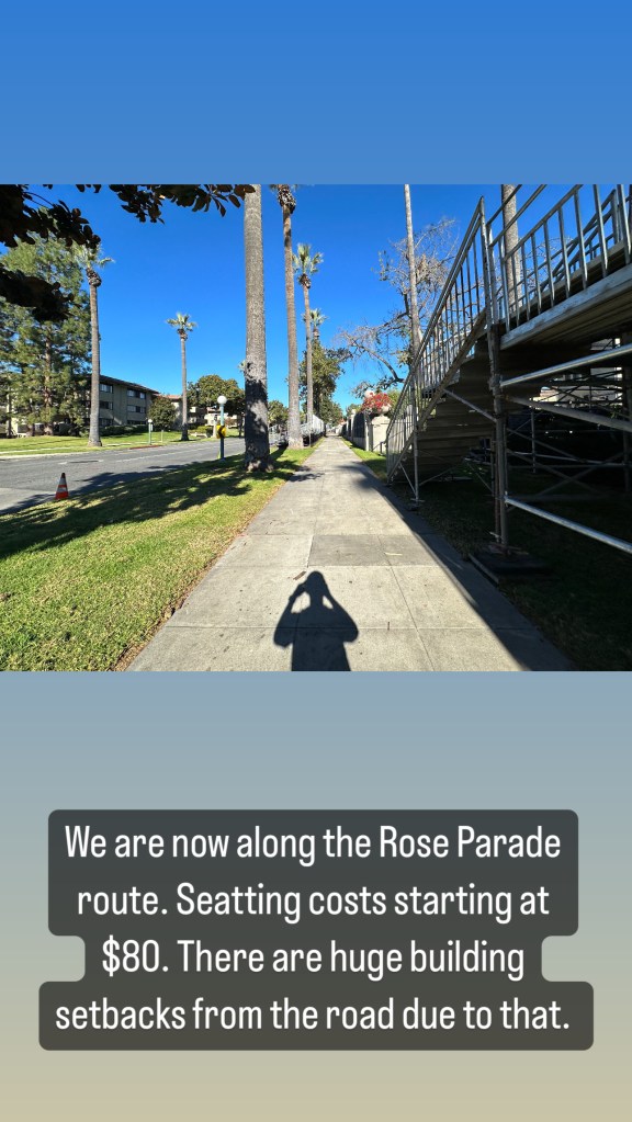 From Fillmore Street, I went up South Raymond Street, left on East California where it is mostly commercial & office zoning. There are plenty of new office developments, including a new USC building for the School of Medicine, and even Huntington Hospital by there as well. Then I went through an older residential area and then right on Orange Grove Boulevard, and I came on to stuff getting set up for the Rose Parade on December 5th!