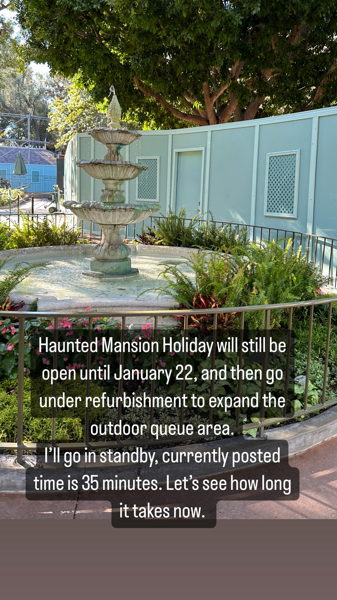Haunted Mansion Holiday will still be open until January 22. Then It will go under refurbishment to expand the outdoor queue area and add an indoor gift shop as the current one is an outdoor kiosk. The outdoor queue area has construction walls already built up and the line is shorted to the pet cemetery, loops back to the front of the veranda, weaved back, and back around. At the time, it took fourteen minutes. Haunted Mansion should reopen in the latter half of 2024, most likely to open in tandem with its neighbor, Tiana’s Bayou Adventure. However, at that point, Haunted Mansion would probably be back in the holiday mode by then.