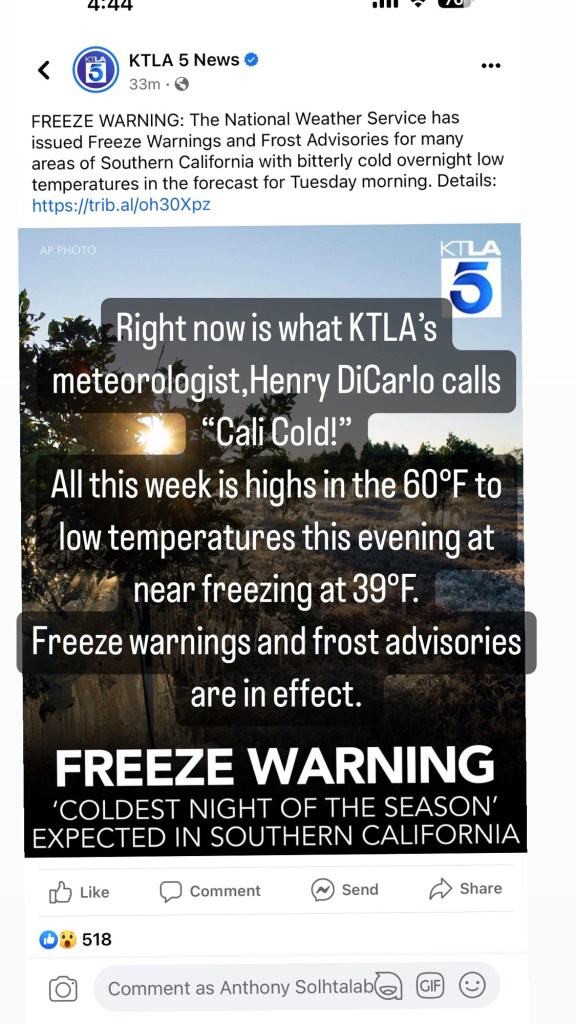 To note as well, January & February can get chilly & even near freezing, please make sure to wear in jacket layers. Highs would be in the low 60s with it being warm in the sun midday, and the lows would be in the high 30s with freeze warning and freeze watches like it was that night. This is what KTLA’s meteorologist, Henry DiCarlo calls “Cali Cold” since this is the coldest it gets for most of California.