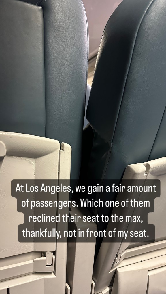 Departing Burbank, everything went smoothly. At Los Angeles Union Station, the train staff swapped out as they are based in LA, and the staff boarding the train is based in San Diego, so the staff can head home from their base area. On board, the boarded passenger reclined his seat back and, thankfully, was in front of the other seat.