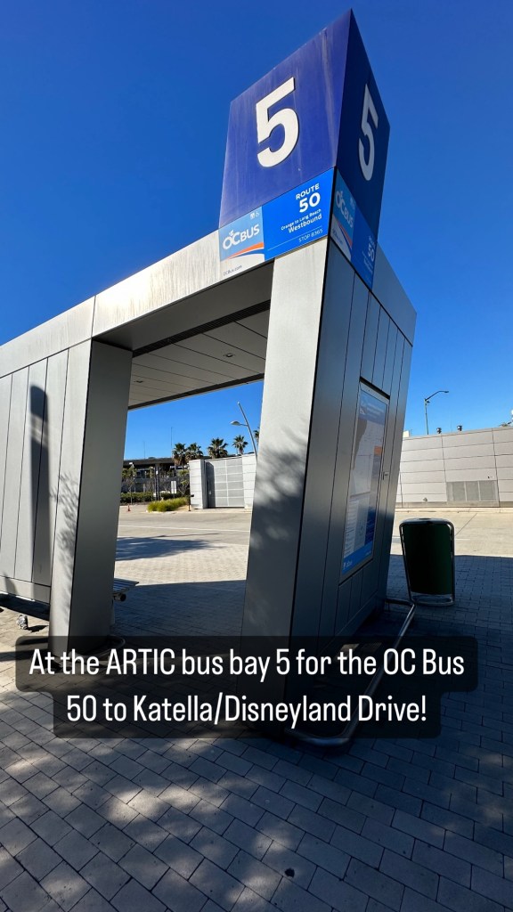 If you are staying in the Anaheim Resort area, you can directly get to the Anaheim Regional Transportation Intermodal Center (ARTIC) with the OC Bus 50 west bus from the Harbor/Katella bus stop to ARTIC for $2 per way or $4.50 day pass on the OC Bus app. You can also take the Anaheim Resort Transportation (ART) for $6 for a day pass, or transfers are included if you bought your Metrolink or Amtrak Pacific Surfliner. You can do an on-demand ART bus with their A Way We Go app.