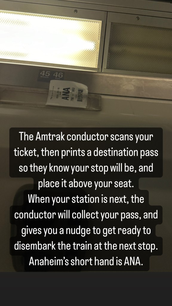 Departing Los Angeles, the Amtrak conductor scans your ticket, then prints a destination pass so they know your stop will be, and places it above your seat. When your station is next, the conductor will collect your pass, and give you a nudge to get ready to disembark the train at the next stop. Anaheim’s shorthand is ANA, Los Angeles Union Station is LAX like the airport, and Burbank is BUR like the adjacent airport.