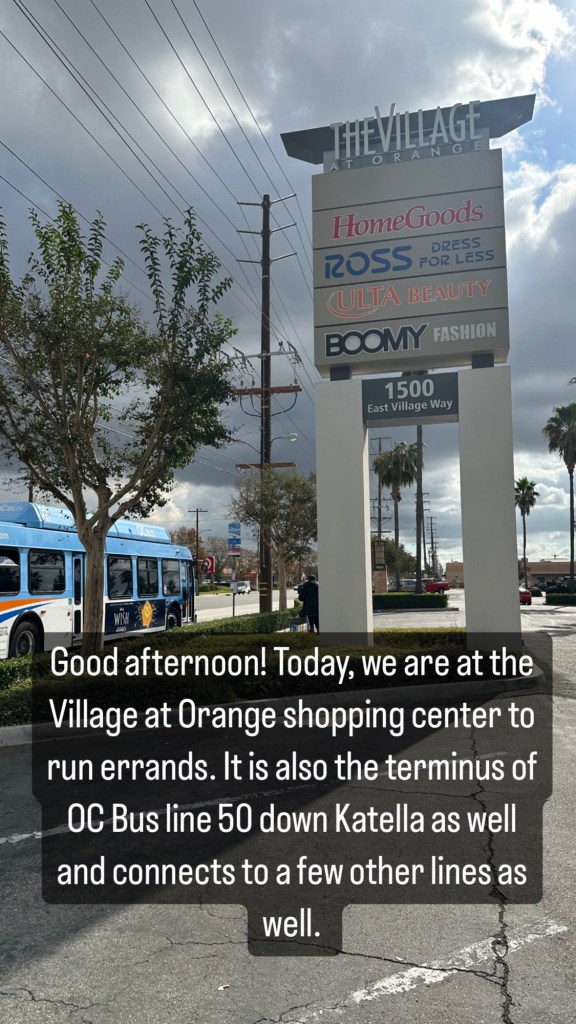 To get there, according to Google Maps, let’s take the OC Bus 50 line east to the Village at Orange, a six mile- 33 minute bus ride from Katella & Harbor, or a 19 minute car drive if you take a rideshare or if you brought your own car.