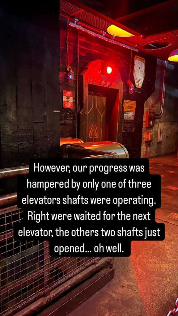 There wasn’t any wait for Guardians of the Galaxy Monsters After Dark, a nighttime Halloween season overlay where you need to rescue Baby Groot with Rocket Raccoon after the events of the regular Mission Breakout. But, our progress was hampered by only one of three elevator shafts operating. Right were waiting for the next elevator, the other two shafts just opened… oh well.