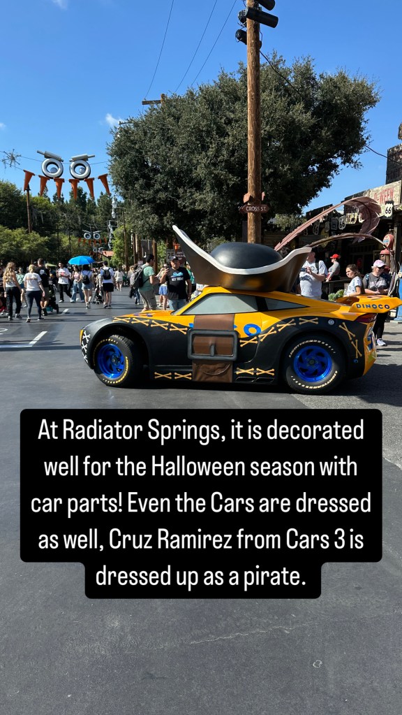 At Radiator Springs, is it decorated well for Halloween season with car parts. Even the cars are dressed up as well, Cruz Ramirez from Cars 3 is dressed up as a pirate. There is a trick or treat trail in Cars Land but no villain. There are two attractions that is changed up for the season, Mater’s Graveyard JamBOOree with Mater singing his version of Halloween tunes. Along with Luigi’s Honkin’ Haul-O-Ween where Luigi’s cousins dance to Halloween tunes from Europe.
