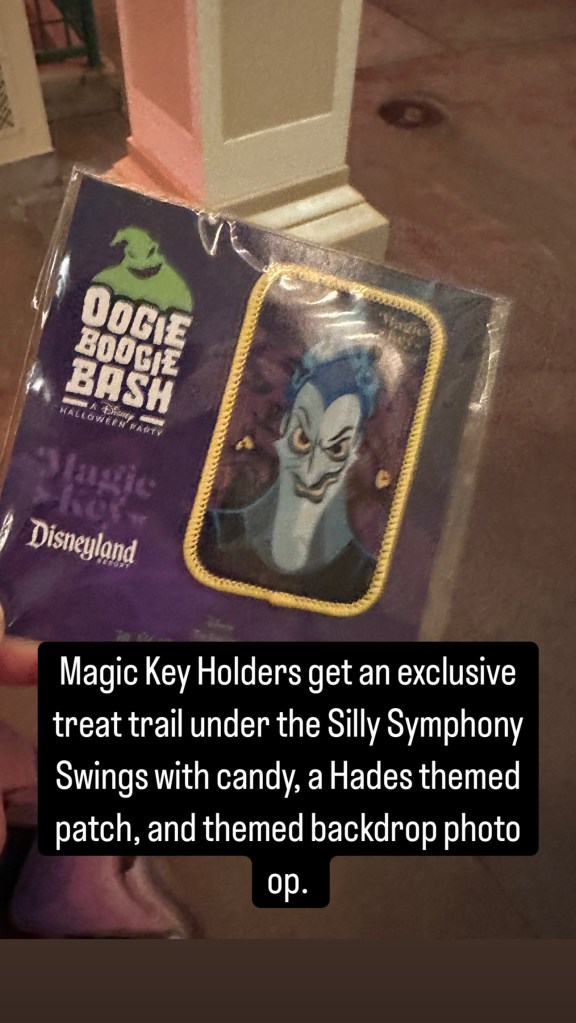 After that, we went to the Silly Symphony Swings for a Magic Key Holder treat trail. After we scanned our passes, we got more candy, a cool Hades themed patch, and a photo opportunity with a backdrop with Hades. But, the line was really long for the photo, so we decided to pass.