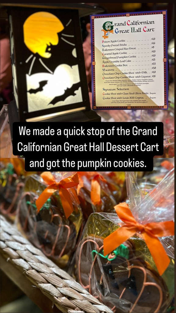 Around Downtown Disney, it is decorated for the Halloween season with lighting and sculptures with the ghosts from the Mickey & friends cartoons. In the Grand Californian Hotel lobby, they have a dessert cart with treats for sale, including pumpkin cookies. Both of these pictures were from another evening that we went to dine out at Downtown Disney.