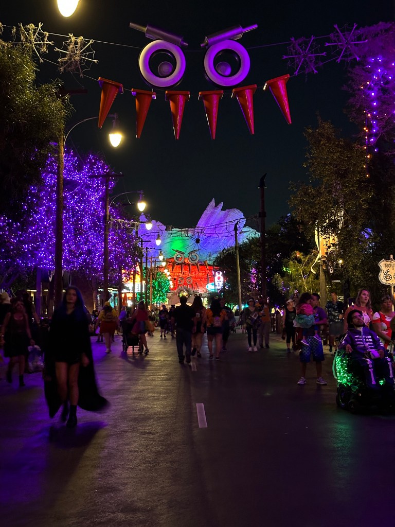 Next, we crossed over the parade corridor to get to the attraction at Pixar Pier as everyone was waiting to see the Frightfully Fun Parade. The parade is an Oogie Boogie Bash exclusive parade featuring Ichabod Crane & the Headless Horseman of Sleepy Hollow, Jack Skellington of the Nightmare Before Christmas, Mickey & Minnie, ghostly ballroom dancers, gravediggers, hitchhiking ghosts, Chestchere Cat, and various villains as well. We always skip it as it is prime time to go on attractions and the trick or treat trails while everyone is distracted by the parade.