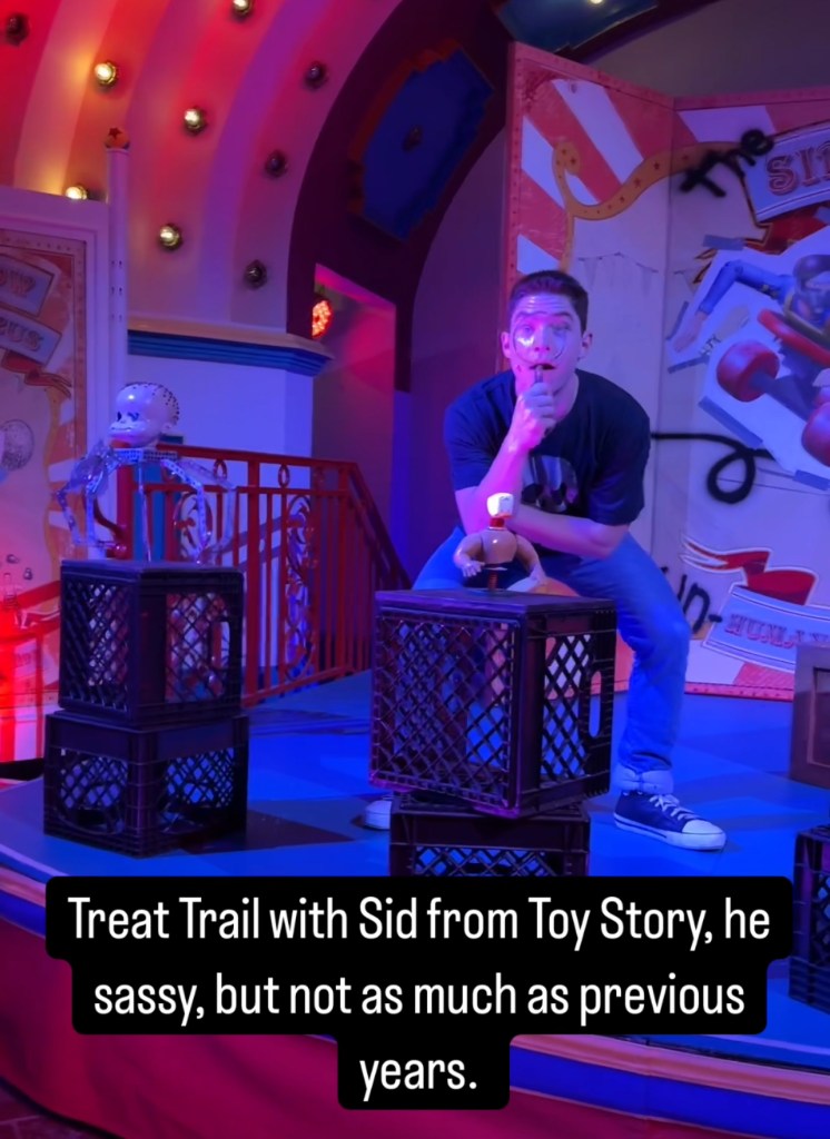 Then we went to our second treat trail at the Pixar Pier bandstand, featuring Sid from Toy Story, a deranged toy surgeon who lives next to Andy in the first Toy Story movie. Sid has the most unhinged (mentally unbalanced) interactions of any character I have seen as his canned lines included his surgeon procedures on his toys, “I know what I am but who are you, that’s right a looser”, gawking at guests not saying anything as the guest is a scary cat, and even mocking guests who dress as him as a copycat. The scary part is that he can be a real-life villain as a bully in your neighborhood. He claims to be 11, when the person portraying him is at least 21 years old.