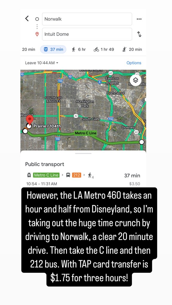 Going from Anaheim to Intuit Dome and SoFi Stadium is not an easy feat by car or transit. You have to take the whole spaghetti network of freeways to get there from Anaheim by car, and parking rates are dynamic & not cheap. Transit is hard as well as you can take the once hourly LA Metro 460 bus to Norwalk LA Metro Rail C line along I-105. At Hawthorn/Lennox, take a Intuit Dome shuttle or LA Metro 212 to Intuit. However, the LA Metro 460 takes an hour from Disneyland, so I’m taking out the huge time crunch by driving to Norwalk, a clear 20 minute drive. Then take the C line and then 212 bus. With TAP card transfer is $1.75 for three hours!