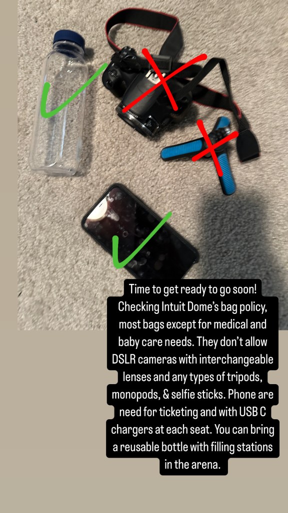Checking Intuit Dome’s bag policy, most bags are not allowed except for medical and baby care needs. They don’t allow DSLR cameras with interchangeable lenses and any types of tripods, monopods, & selfie sticks. Phones are needed for ticketing as tickets are only able to load on the “Intuit Dome + Clippers” app. You can bring a USB C charger to top off your phone at each seat. You can bring a reusable bottle up to 32 oz. with filling stations in the arena.