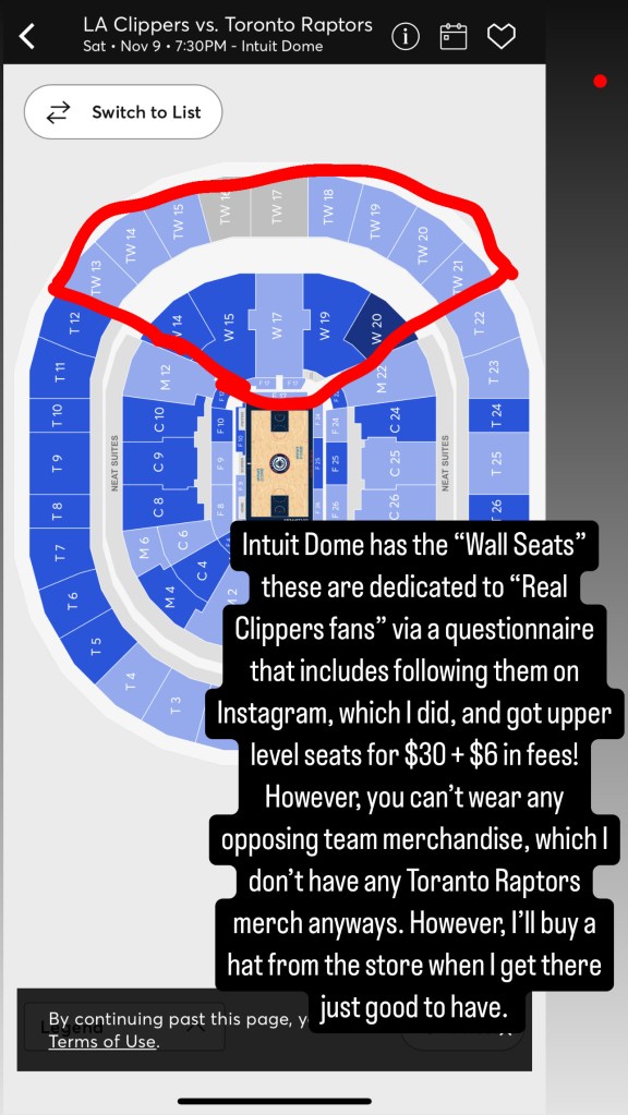 Intuit Dome has the “Wall Seats” that are dedicated to “Real Clippers Fans” with the Chuckmark, named after the Clippers mascot, Chuck the Condor, you answer a questionnaire that included following them on Instagram that did, and more. Once approved, I was capable of getting upper level terrace seats for $30 + $6 fees. However, you “should” not wear an opponent’s merchandise, I don’t have any Toronto Raptors merchandise anyways. I’ll get a Clipper hat to show that I am a Clippers “fan”.