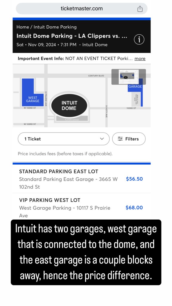 Intuit has two garages, the west garage that is connected to the dome for $68, and the east garage is a couple blocks away for $56.50, hence the price difference. Tickets can be bought online the day of the event.