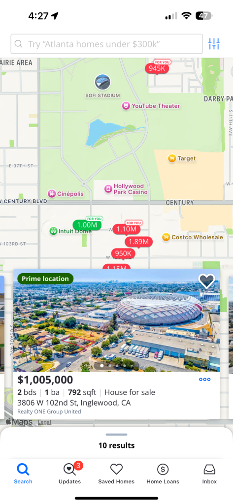 I wondered about how much the land value has increased in Inglewood with proximity to not only SoFi Stadium, YouTube Theater, and now Intuit Dome. Now, an adjacent home that is only and needs a lot of TLC is now over $1 million for a fixer upper that was built in 1938! No one in Inglewood can afford to live there anymore.