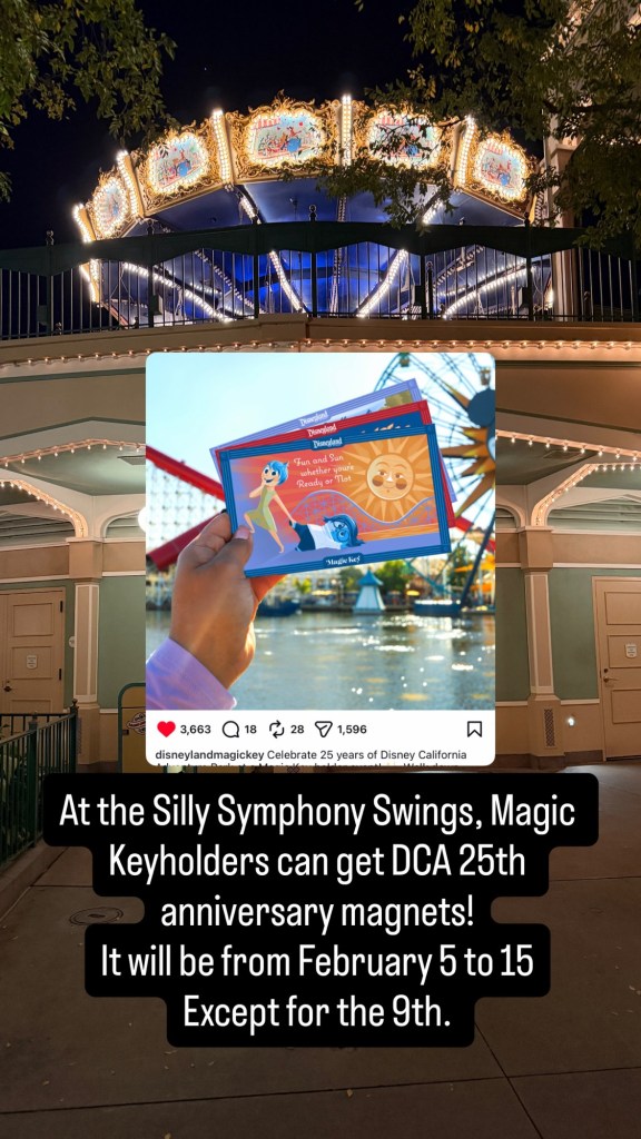 At the Silly Symphony Swings, Magic Keyholders can get DCA 25th anniversary magnets! It will be from February 5 to 15. Except for the 9th.