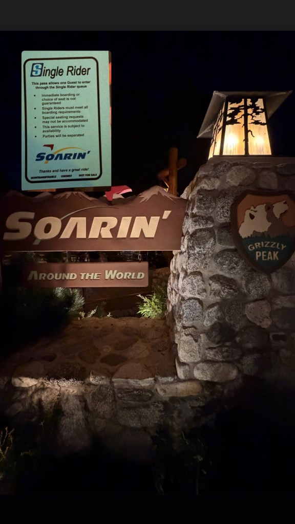 Soarin’ is at 50 minute wait but I got to the front of the boarding line with the Single Rider! Single Rider is not heavily advertised on Soarin’ in comparison to other attractions, so the wait can be quick. Single Rider is a queuing system that a single guest fills in gaps in the seating in the ride vehicle from odd amount of guests.