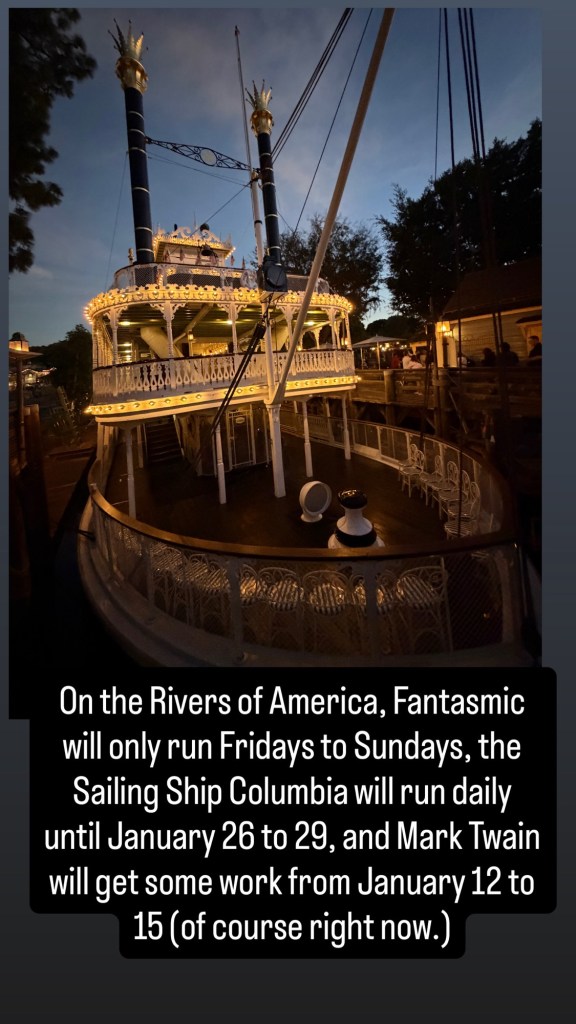 On the Rivers of America, Fantasmic will only run Fridays to Sundays, the Sailing Ship Columbia will run daily until January 26 to 29, and Mark Twain will get some work from January 12 to 15 (of course that is the day of my visit).